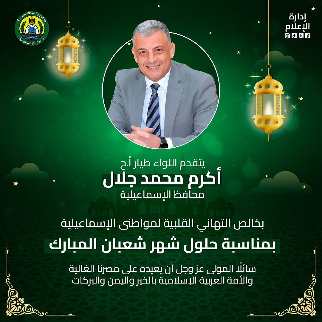اللواء طيار ا.ح/ أكرم محمد جلال - محافظ الإسماعيلية، يهنئ مواطني الإسماعيلية، بحلول شهر شعبان المبارك