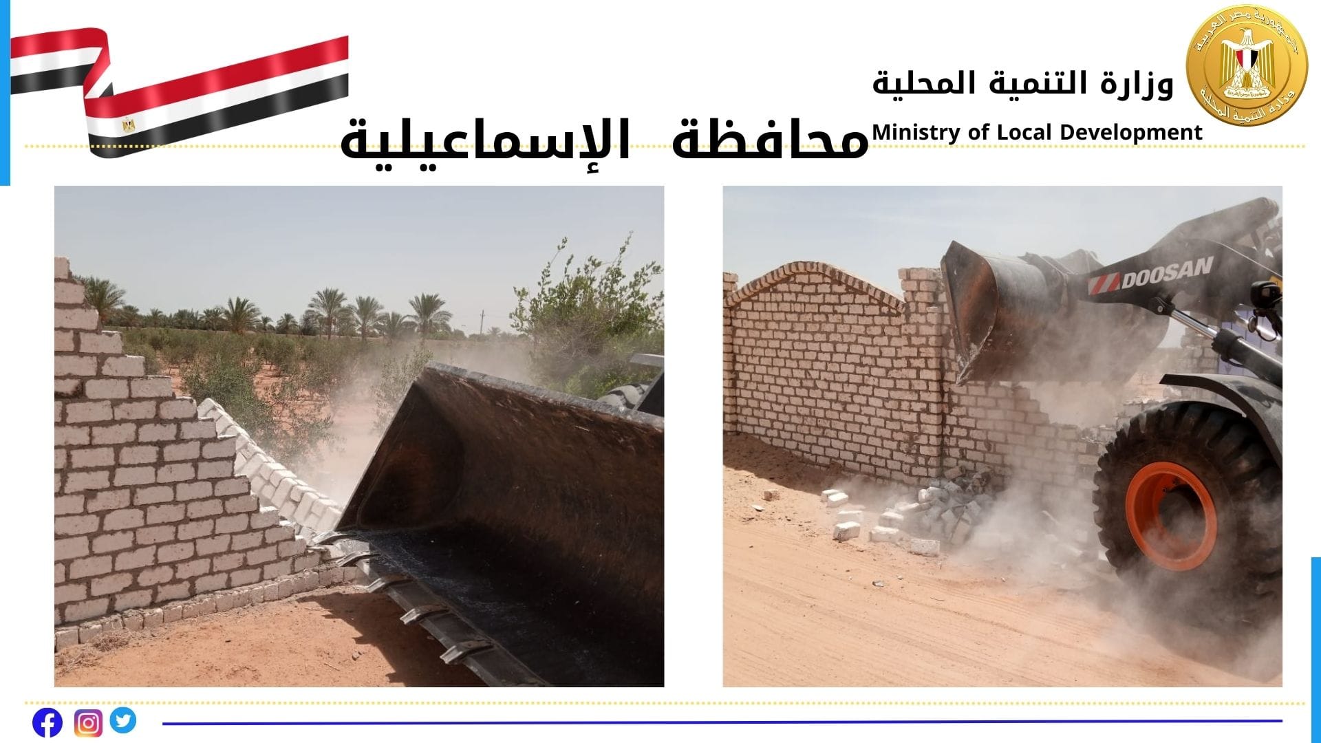وفى الإسماعيلية ..أكد اللواء شريف فهمي بشارة محافظ الإسماعيلية على استمرار نزول حملات إزالة التعديات على الأراضى الزراعية وأملاك الدولة حيث أسفرت الحملة عن إزالة ١١ حالة تعدٍّ على أراضي أملاك الدولة بولاية المحافظة على مساحة ١٠٨٤ متر مربع، عبارة عن أسوار ومباني غير مكتملة البناء وغير مأهولة بالسكان كما تم إزالة ٥٧ حالات تعدٍّ على أراضي ولاية الزراعة، على مساحة ٤ أفدنة و١٨ قيراط، عبارة عن أسوار ومباني غير مكتملة البناء وغير مأهولة بالسكان.