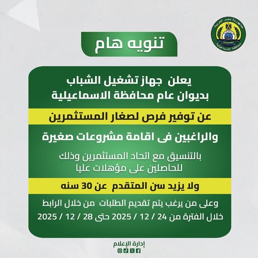 يعلن جهاز تشغيل الشباب بديوان عام محافظة الإسماعيلية عن توفير عدد من فرص العمل للشباب