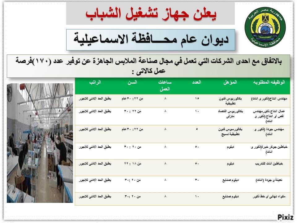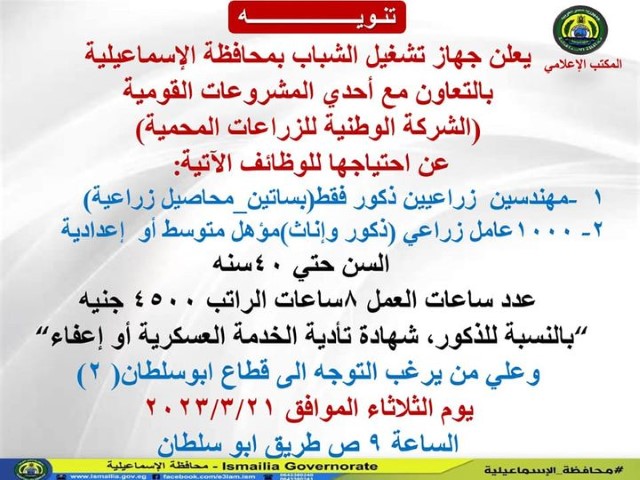 يعلن جهاز تشغيل الشباب بديوان عام محافظة الإسماعيلية عن توفير عدد من فرص العمل للشباب