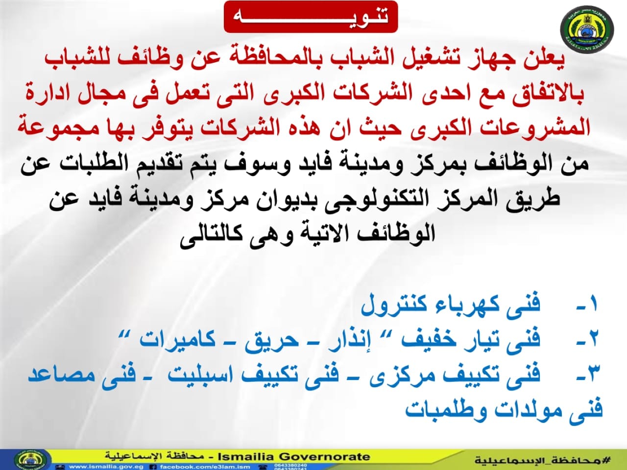 يعلن جهاز تشغيل الشباب عن توافر فرص عمل بمركز ومدينة فايد