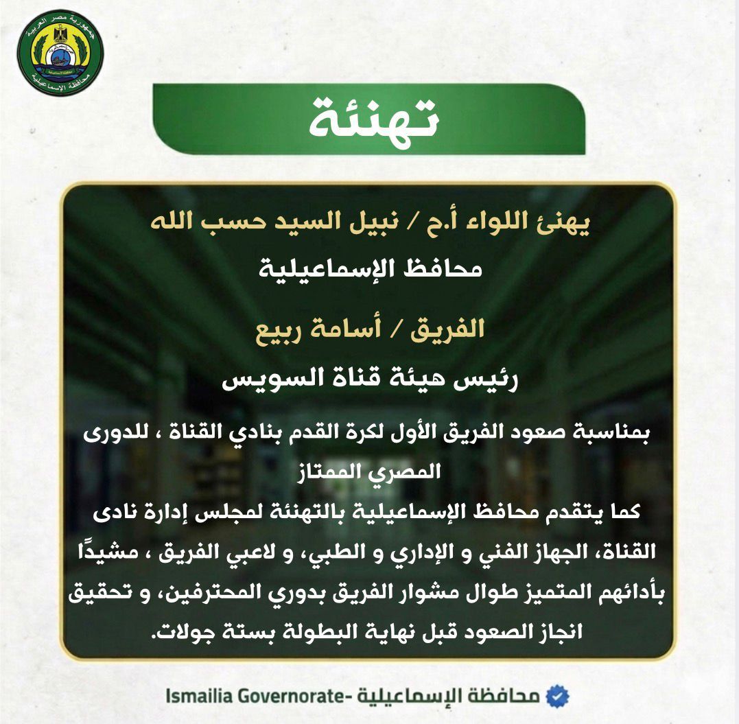 هنأ اللواء أ.ح نبيل السيد حسب الله، محافظ الإسماعيلية، الفريق أسامة ربيع، رئيس هيئة قناة السويس، بمناسبة صعود الفريق الأول لكرة القدم بنادي القناة، للدوري المصري الممتاز قراءة المزيد